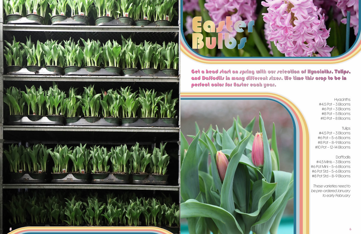 Get a head start on spring with our selection of Hyacinths, Tulips, and Daffodils in many different sizes. We time this crop to be in perfect color for Easter each year.