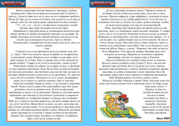 Да ли је Арсеније дохватио лепоту ? Прошле године на летовању она му је била на дохват руке . Јесте све се лепо удесило . Прелепа природа , старе грађевине у позадини и младе девојке доносили су му осећај пријатности . То је све што су помињали они који су успели да се јаве у радио-емисију . Једино је недостајала ракија , али није он господин Брзић . Ипак , Арсеније није пружио руку ни према једној од три лепотице , које су се башкариле поред његовог пешкира . У ствари јесте , али то се не рачуна . Плавуша га молила да јој да новине . Испружио је Арсеније руку , али није дотакао лепу девојку . Ух , и сад му кроз тело прођу жмарци кад се сети плавуше . Не зна се шта је лепше на њој . Има лице које је тешко описати . Арси се чинило да је плавушина глава воћна . Очи су јој бадемасте , уста сочна као јабука . Баш је „ слатка “. Нажалост ово воће за њега је било забрањено . Тело прелепе девојке Арсеније није смео отворено да погледа . Пријатно је осмотрити савршене пропорције , али кад ти супруга није у близини .