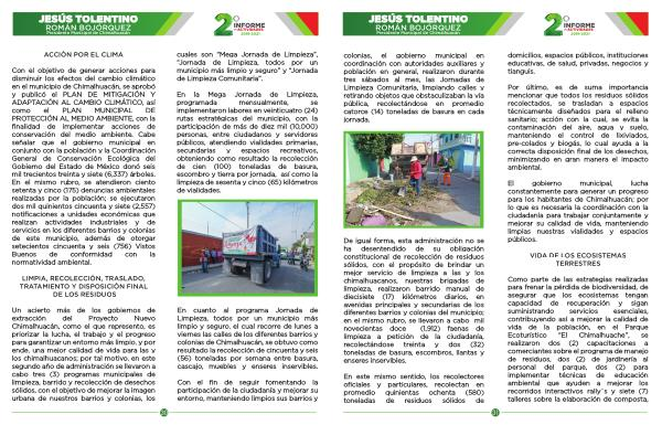 Con el objetivo de generar acciones para disminuir los efectos del cambio climático en el municipio de Chimalhuacán , se aprobó y publicó el PLAN DE MITIGACIÓN Y ADAPTACIÓN AL CAMBIO CLIMÁTICO , así como el PLAN MUNICIPAL DE PROTECCIÓN AL MEDIO AMBIENTE , con la finalidad de implementar acciones de conservación del medio ambiente . Cabe señalar que el gobierno municipal en conjunto con la población y la Coordinación General de Conservación Ecológica del Gobierno del Estado de México donó seis mil trecientos treinta y siete ( 6,337 ) árboles . En el mismo rubro , se atendieron ciento setenta y cinco ( 175 ) denuncias ambientales realizadas por la población ; se ejecutaron dos mil quinientos cincuenta y siete ( 2,557 ) notificaciones a unidades económicas que realizan actividades industriales y de servicios en los diferentes barrios y colonias de este municipio , además de otorgar setecientos cincuenta y seis ( 756 ) Vistos Buenos de conformidad con la normatividad ambiental .