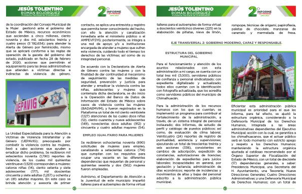 Para la administración de los recursos humanos con los que se cuentan , se implementó un programa para contribuir al fortalecimiento de la administración , a través , de un sistema integral de personal instaurado ; dos informes , de estudio de perfil y catálogo de puestos públicos ; así como , de evaluación de clima laboral . Veinticuatro ( 24 ) reportes de registro de puntualidad , asistencia y supervisiones ; ejecutando un total de trescientas treinta y seis acciones ( 336 ), consistentes en cambios de adscripción , expedición de constancias , autorizaciones de licencias ; elaboración de expedientes para juicios laborales ; incapacidades en general , por gestación y lactancia ; administración de días económicos ; reporte de incidencias y movimientos de altas y bajas del personal adscrito a la administración pública municipal .