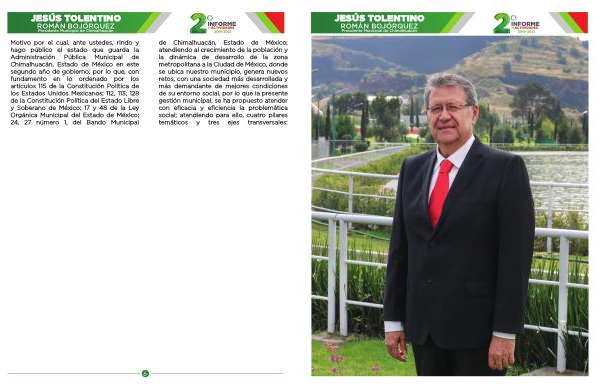 Motivo por el cual , ante ustedes , rindo y hago público el estado que guarda la Administración Pública Municipal de Chimalhuacán , Estado de México en este segundo año de gobierno ; por lo que , con fundamento en lo ordenado por los artículos 115 de la Constitución Política de los Estados Unidos Mexicanos ; 112 , 113 , 128 de la Constitución Política del Estado Libre y Soberano de México ; 17 y 48 de la Ley Orgánica Municipal del Estado de México ; 24 , 27 número 1 , del Bando Municipal de Chimalhuacán , Estado de México ; atendiendo al crecimiento de la población y la dinámica de desarrollo de la zona metropolitana a la Ciudad de México , donde se ubica nuestro municipio , genera nuevos retos , con una sociedad más desarrollada y más demandante de mejores condiciones de su entorno social , por lo que la presente gestión municipal , se ha propuesto atender con eficacia y eficiencia la problemática social ; atendiendo para ello , cuatro pilares temáticos y tres ejes transversales :