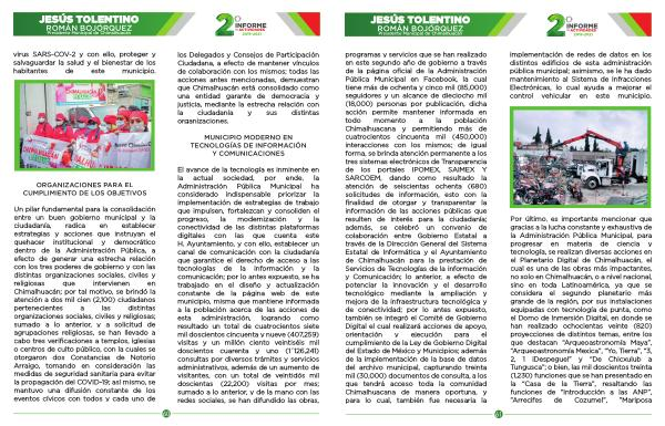 El avance de la tecnología es inminente en la actual sociedad , por ende , la Administración Pública Municipal ha considerado indispensable priorizar la implementación de estrategias de trabajo que impulsen , fortalezcan y consoliden el progreso , la modernización y la conectividad de las distintas plataformas digitales con las que cuenta este H . Ayuntamiento , y con ello , establecer un canal de comunicación con la ciudadanía que garantice el derecho de acceso a las tecnologías de la información y la comunicación ; por lo antes expuesto , se ha trabajado en el diseño y actualización constante de la página web de este municipio , misma que mantiene informada a la población acerca de las acciones de esta administración , logrando como resultado un total de cuatrocientos siete mil doscientos cincuenta y nueve ( 407,259 ) visitas y un millón ciento veintiséis mil doscientos cuarenta y uno ( 1 ´ 126,241 ) consultas por diversos trámites y servicios administrativos , además de un aumento de visitantes , con un total de veintidós mil doscientas ( 22,200 ) visitas por mes ; sumado a lo anterior , y de la mano con las redes sociales , se han difundido las obras ,