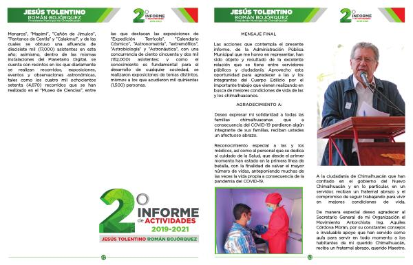 Las acciones que contempla el presente informe , de la Administración Pública Municipal que me honro en representar , han sido objeto y resultado de la excelente relación que se tiene entre servidores públicos y ciudadanía . Aprovecho esta oportunidad para agradecer a las y los integrantes del Cuerpo Edilicio por el importante trabajo que vienen realizando en busca de mejores condiciones de vida de las y los chimalhuacanos .