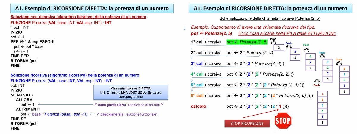 A1. Esempio di RICORSIONE DIRETTA: la potenza di un numero Schematizzazione della chiamata ricorsiva Potenza( 2, 5)