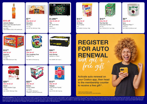 Terms and Conditions: Only valid in Costco warehouses located in Australia and while stock lasts. All items may not be available in every warehous are representations and colours and variants shown may not be available on sale. Liquor is not available in QLD and SA locations. WA is subject to page are accurate when posted and subject to change in the future. It is against the law to sell or supply alcohol to, or obtain alcohol on behalf of, a LIQP770016625, LIQP770017058. ACT-14005609. VIC-32061303, 32064440, 32065682, 32067781. WA-603213623419.