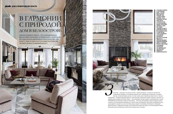 Заказчики – молодая и активная семья с тремя дочерьми . Основные пожелания – стремление передать в интерьере энергичный , современный характер , гостеприимство , активный образ жизни , а также отдать дань семейным ценностям и теплым традициям . « Главной задачей проекта стало желание заказчика создать уютный , светлый , современный интерьер для всей семьи , – рассказывают авторы проекта , руководители студии FINTERIO Юлия Блатова и Кирилл Неустроев . – Поэтому при выборе отделки предпочтение отдалось использованию природных и экологичных материалов . Большие панорамные окна в два уровня с видом на сад и сосновую рощу задают атмосферу сближения с природой . Дополнением к природным видам и центральным элементом дома стал благородный камин , облицованный натуральным гранитом и карельским сланцем ».
