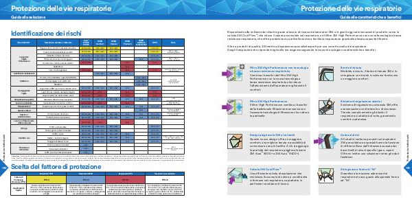 * Attenzione: Questa guida è soltanto uno schema esemplificativo. Essa non dovrebbe essere usata come unica modalità per la scelta del respiratore. I dettagli riguardanti le prestazioni ed i limiti sono scritti sulla scatola del prodotto e sulle relative istruzioni d’ uso. Prima di utilizzare qualsiasi respiratore, l’ utilizzatore deve leggere e comprendere le istruzioni d’ uso del prodotto. Deve essere osservata la specifica normativa per ogni Paese. Questa presentazione non è esaustiva di tutti i prodotti adatti ad ogni specifica esigenza. La scelta del respiratore più appropriato dipende dalla specifica situazione e deve essere fatta da una persona competente ed a conoscenza delle condizioni di lavoro e dei limiti di ogni dispositivo di protezione delle vie respiratorie.