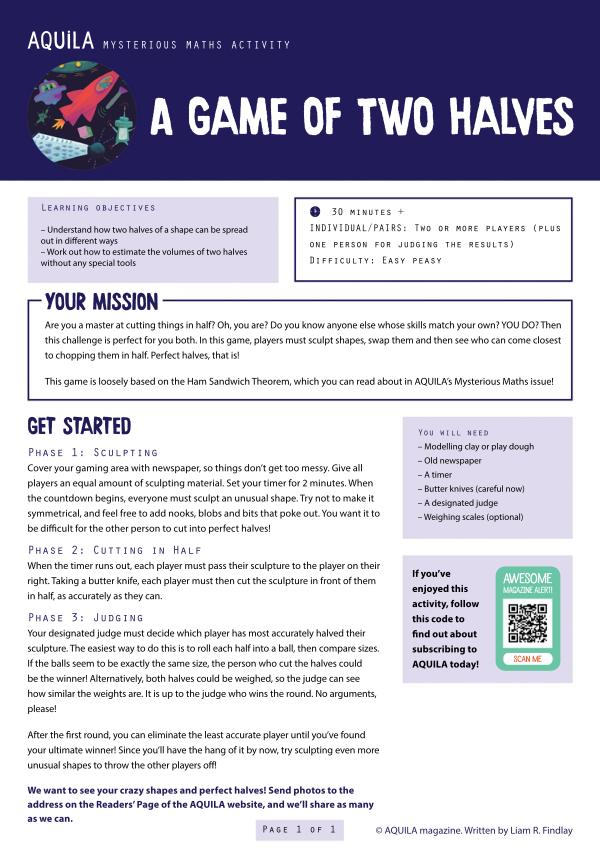 ThisgameislooselybasedontheHam SandwichTheorem , whichyoucanreadaboutinAQUILA ’ sMysteriousMathsisue !