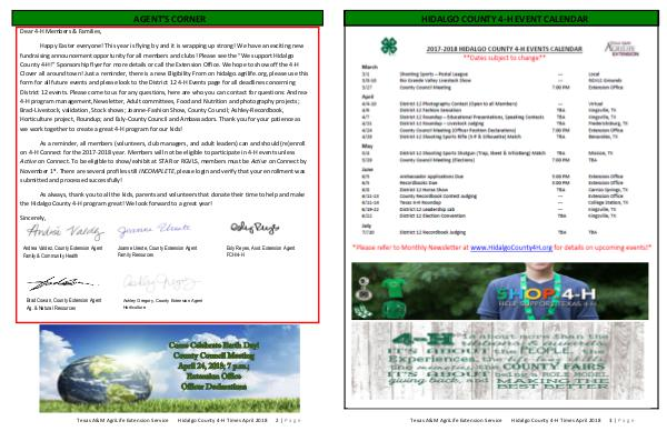 HIDALGO COUNTY 4-H EVENT CALENDAR Texas A&M AgriLife Extension Service Hidalgo County 4-H Times April 2018 3 | Page