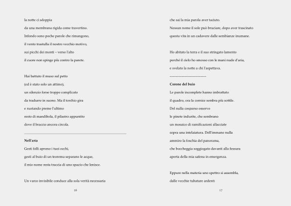 la notte ci sdoppia da una membrana rigida come travertino . Infondo sono poche parole che rimangono , il vento trastulla il nostro vecchio motivo , sui picchi dei monti – verso l ' alto il cuore non spinge più contro la parete .