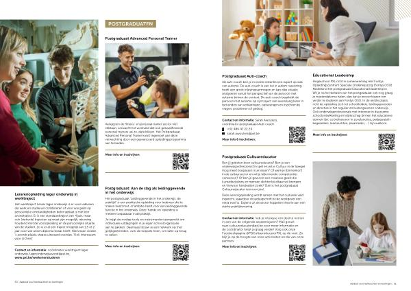 Hogeschool PXL richt in samenwerking met Fontys Opleidingscentrum Speciale Onderwijszorg ( Fontys OSO ) Nederland het postgraduaat Educational leadership in . Wil je na het behalen van het postgraduaat ook nog graag je masterdiploma halen , dan kan je ervoor kiezen om verder te studeren aan Fontys OSO . In de eerste plaats richt de opleiding zich tot schoolleiders , leidinggevenden en directies in het regulier en buitengewoon onderwijs . Ook onderwijsprofessionals met interesse in duurzame schoolontwikkeling en leiderschap binnen het educatieve domein ( bv . coördinatoren in zorgfuncties , pedagogisch begeleiders , leerkrachten , paramedici , ...) zijn welkom .