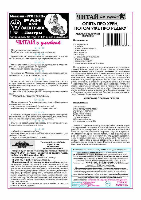 Адрес редакции и для писем: 346780 Ростовская обл., г. Азов, ул. Московская, 25. Адрес издателя: г. Азов, ул. Петровский б-р, 19 / 57 E-mail: azovgazeta @ mail. ru ПОДПИСНОЙ ИНДЕКС ИЗДАНИЯ— ПМ698 Отпечатано: ИП ГОЛУБЕВА О. А., Адрес: 346780 г. Азов, Петровский б-р, 23 Цена 20 руб. Заказ № 1379. Дата выхода в свет: 25.11.2025 г., в 14.00.