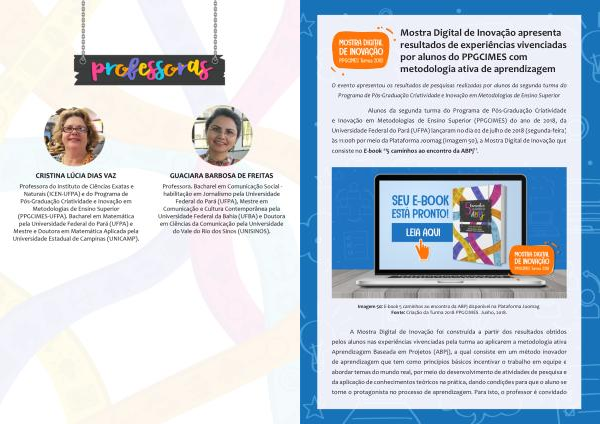 Alunos da segunda turma do Programa de Pós-Graduação Criatividade e Inovação em Metodologias de Ensino Superior ( PPGCIMES ) do ano de 2018 , da Universidade Federal do Pará ( UFPA ) lançaram no dia 02 de julho de 2018 ( segunda-feira ) às 11:00h por meio da Plataforma Joomag ( Imagem 50 ), a Mostra Digital de Inovação que consiste no E-book “ 5 caminhos ao encontro da ABPj ”.