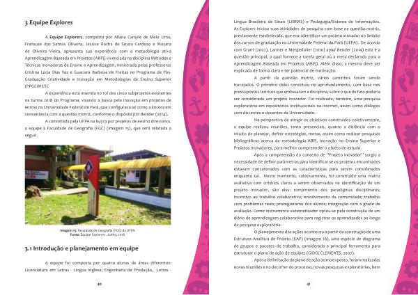 Língua Brasileira de Sinais ( LIBRAS ) e Pedagogia / Sistema de Informações . As Explores iniciou suas atividades de pesquisa com base na questão motriz , previamente estabelecida , que era : Identificar um projeto inovador no âmbito dos cursos de graduação na Universidade Federal do Pará ( UFPA ). De acordo com Grant ( 2002 ), Larmer e Mergedoller ( 2010 ) apud Bender ( 2014 ) esta é a questão principal , a qual fornece a tarefa geral ou a meta declarada para a Aprendizagem Baseada em Projetos ( ABPj ). Além disso , a mesma deve ser explicada de forma clara e ter potencial de motivação .