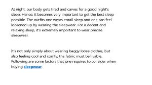 At night , our body gets tired and carves for a good night ' s sleep . Hence , it becomes very important to get the best sleep possible . The outfits one wears entail sleep and one can feel loosened up by wearing the sleepwear . For a decent and relaxing sleep , it ' s extremely important to wear precise sleepwear .