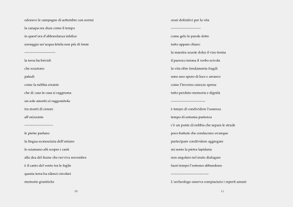 orari definitivi per la vita -------------------------- come gelo le parole dette tutto appare chiaro la maestra scuote dolce il viso trema il parroco intona il verbo scivola la vita oltre fondamenta fragili sono uno sputo di luce e arranco come l ’ inverno carezze sperse tutto perduto memoria e dignità ------------------------------ è tempo di condividere l ’ assenza tempo di estrema partenza c ’ è un ponte di nebbia che separa le strade poco battute che conducono ovunque partecipare condividere aggregare mi sento la pietra lapidaria non angolare nel muto dialogare fuori tempo l ’ estremo abbandono --------------------------------- L ’ archeologo osserva compiaciuto i reperti umani