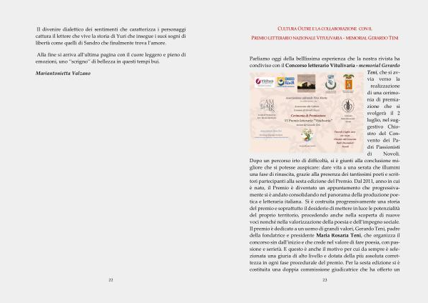 Parliamo oggi della belllissima esperienza che la nostra rivista ha condiviso con il Concorso letterario Vitulivaria - memorial Gerardo Teni , che si avvia verso la realizzazione di una cerimonia di premiazione che si svolgerà il 2 luglio , nel suggestivo Chiostro del Convento dei Padri Passionisti di Novoli . Dopo un percorso irto di difficoltà , si è giunti alla conclusione migliore che si potesse auspicare : dare vita a una serata che illumini una fase di rinascita , grazie alla presenza dei tantissimi poeti e scrittori partecipanti alla sesta edizione del Premio . Dal 2011 , anno in cui è nato , il Premio è diventato un appuntamento che progressivamente si è andato consolidando nel panorama della produzione poetica e letteraria italiana . Si è costruita progressivamente una storia del premio e soprattutto il desiderio di mettere in luce le potenzialità del proprio territorio , procedendo anche nella scoperta di nuove voci nonché nella valorizzazione della poesia e dell ’ impegno sociale . Il premio è dedicato a un uomo di grandi valori , Gerardo Teni , padre della fondatrice e presidente Maria Rosaria Teni , che organizza il concorso sin dall ’ inizio e che crede nel valore di fare poesia , con passione e serietà . E questo è anche il motivo per cui da sempre è selezionata una giuria di alto livello e dotata della più assoluta correttezza in ogni fase procedurale del premio . Per la sesta edizione si è costituita una doppia commissione giudicatrice che ha offerto un