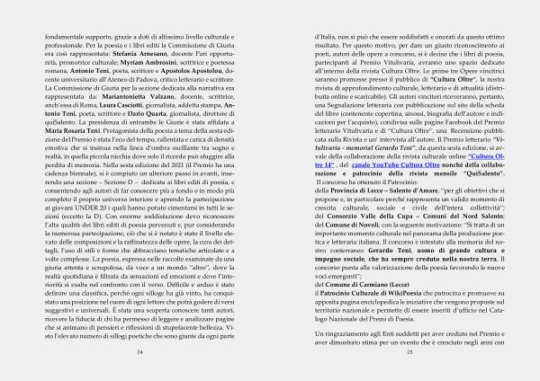 d ’ Italia , non si può che essere soddisfatti e onorati da questo ottimo risultato . Per questo motivo , per dare un giusto riconoscimento ai poeti , autori delle opere a concorso , si è deciso che i libri di poesia , partecipanti al Premio Vitulivaria , avranno uno spazio dedicato all ’ interno della rivista Cultura Oltre . Le prime tre Opere vincitrici saranno promosse presso il pubblico di “ Cultura Oltre ”, la nostra rivista di approfondimento culturale , letterario e di attualità ( distribuita online e scaricabile ). Gli autori vincitori riceveranno , pertanto , una Segnalazione letteraria con pubblicazione sul sito della scheda del libro ( contenente copertina , sinossi , biografia dell ’ autore e indicazioni per l ’ acquisto ), condivisa sulle pagine Facebook del Premio letterario Vitulivaria e di “ Cultura Oltre ”, una Recensione pubblicata sulla Rivista e un ’ intervista all ’ autore . Il Premio letterario “ Vitulivaria - memorial Gerardo Teni ”, da questa sesta edizione , si avvale della collaborazione della rivista culturale online