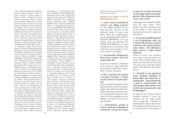 3- Chi è e perché scrive poesie e in quale occasione e a quale età ha scritto la sua prima poesia ? Sono una malata di parole . La mia prima poesia la scrissi in un pomeriggio estivo all ’ età di undici anni , chiusa nella mia cameretta , mentre i miei familiari riposavano . Ricordo che la accompagnai con un disegno , e da allora non mi sono più arrestata .