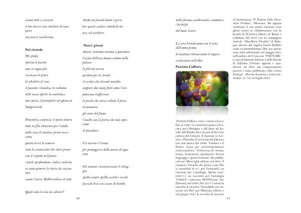 Nel ricordo Mi sfaldo sfarino le parole non vi seguo più rovinano le pietre lo scheletro di voci il passato s ’ innalza , lo vediamo nelle mani aperte in controluce uno sparo , il pianoforte nel ghiaccio . Sempreverde .