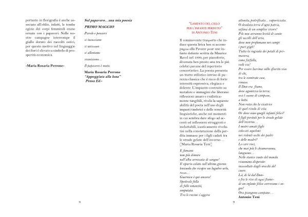 9 attonita , pietrificata … vaporizzata . O desolata terra d ’ ogni patria , orfana di un semplice vivere ! Più non avranno levità di canto gli uccelli dell ’ aria , dove non profumano nei campi i puri gigli ! Tutta la rugiada dei petali di primavera , come farfalla , volò via ! Per essere lacrima sullo sfiorito viso di chi , tra le sventrate case , rimase . Il Don era fiume , dove agonizza la terra ; ora è suono di campane , a lutto . Non resta che la cicatrice di quel rivolo di vita . Or dove sono quegli infanti felici ? I figli perduti per le strade gelate dell ’ inverno … I nostri amati figli : colorati aquiloni nei ridenti occhi dei padri e delle madri ? Le care voci , che mai più li chiameranno , languono … Nelle stanze vuote del mondo risuonano disperate : inascoltate dagli orecchi del cuore . Là , di là dal Done fra le rive di ogni fiumedi un infante felice correvano i sogni ! Ora piangono campane … Antonio Teni