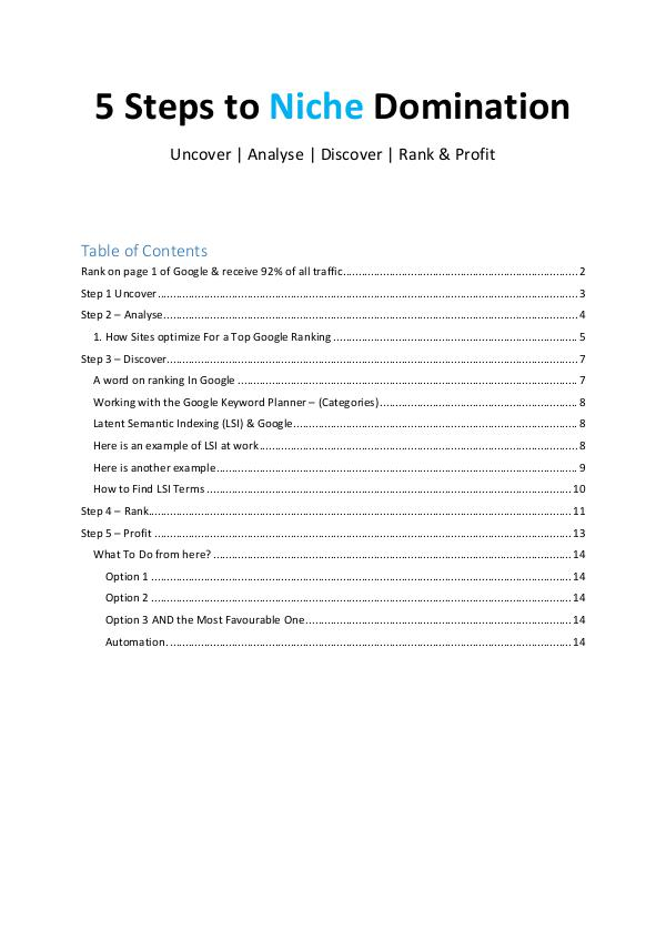 Step 3 – Discover..................................................................................................................................... 7 A word on ranking In Google.............................................................................................................. 7 Working with the Google Keyword Planner –( Categories)................................................................ 8 Latent Semantic Indexing( LSI) & Google............................................................................................ 8 Here is an example of LSI at work....................................................................................................... 8 Here is another example..................................................................................................................... 9 How to Find LSI Terms...................................................................................................................... 10 Step 4 – Rank......................................................................................................................................... 11 Step 5 – Profit....................................................................................................................................... 13