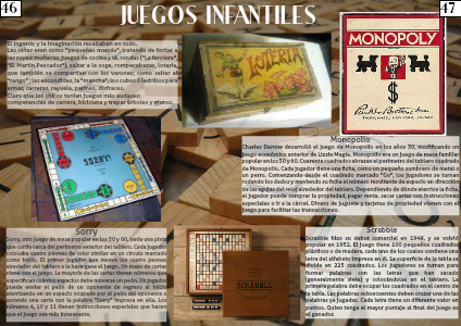 Las niñas eran como "pequeñas mamás", tratando de imitar a las suyas: muñecas, juegos de cocina y té, rondas ("La farolera", "El Martín Pescador"), saltar a la soga, rompecabezas, lotería, que también se compartían con los varones; como saltar al "rango" ; las escondidas, la "mancha", los cubos ó ladrillos para armar, carreras, rayuela, patines, disfraces.