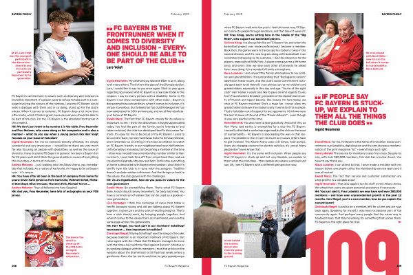 BAYERN FAMILY when FC Bayern walk onto the pitch . I feel the same way . FC Bayern connects people through emotions , and that doesn ‘ t wear off . HH : Frau Krieg , you ‘ re sitting here in the hoodie of the ″ Big Reds “, who support our basketball players . Corinna Krieg : I ‘ ve always felt like an FC Bayern fan , and when the basketball project was made professional , I became a member . Back then , the games were in the ice sports stadium . It was in the second division , and it ‘ s nice to grow along with basketball . I can recommend dropping by to everyone . I like the closeness to the players , especially at BMW Park . A player even gave me a lift home once , and every time we saw each other afterwards he asked how I was doing . It ‘ s a wonderful family atmosphere . Ilana Lubelski : I also impart this family atmosphere to my children and grandchildren . It ‘ s outstanding that ″ Red against racism “ addresses these issues , and the club ‘ s social commitment actually goes back to Uli Hoeneß . I can always say to my children and grandchildren , especially in this day and age : “ You ‘ re at the right club !” Herr Hainer , I would also like to pass on kind regards to you from Frau Charlotte Knobloch , president of the Jewish Community of Munich and Upper Bavaria . She knows I ‘ m here today , we chat at FC Bayern matches ! She ‘ s a huge fan . I never allow my grandchildren to leave the stadium early if we ’ ve lost for example . That ‘ s forbidden out of respect for our opponents . I think we were the last to leave at the end of the ″ Finale dahoam “ – even though it was very painful at the time . Hans Behrend : You also have to lose gracefully . And all of this , as Herr Manz said earlier , is exemplified by a club like FC Bayern . I recently attended a workshop organised by the club on the issue of sustainability – FC Bayern is also leading the way in that respect . The problem is that it can ‘ t do much on its own , others have to get involved . The Allianz Arena uses LED lamps , heat pumps , there are charging stations for electric vehicles , it ’ s unreal . Many people don ‘ t even know that . Ingrid Neumeier : It ‘ s the same with inclusion . When people say that FC Bayern is stuck-up and not very likeable , we explain to them what this club does – then people are always surprised and say : Oh , I see FC Bayern with a different perspective now .