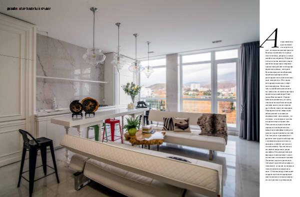 Апартаменты расположены в пентхаусе, в нескольких метрах от благоустроенного городского пляжа, рядом с ландшафтным парком. Отделка стен и полов во всех помещениях квартиры керамогранитом делает интерьер единым целым, которое благодаря разнообразию приемов декора легко распадается на многозначные элементы. Это одна из парадоксальных черт постмодерна. Большую часть мебели выполнили на заказ по эскизам автора проекта дизайнера Светланы Веселовой. Современная живопись и часть геологической коллекции хозяев выступили в роли арт-объектов в интерьере. Парадная зона квартиры объединяет основные помещения: прихожую, гостиную, столовую и кухню в единое пространство. Получилось просторное, хорошо освещенное помещение комфортное для жизни и для приема гостей. Гостиную от прихожей отделяет контрастный портал с элементами античного ордера, словно цитата из стиля ампир. Кухня-ниша не имеет верхнего ряда шкафов. Ее декоративные фасады напоминают классические стеновые панели. За ними скрыты дополнительные кухонные шкафы с техникой, а также основные технические коммуникации. Столешницу освещает подвесной светодиодный светильник в тонком корпусе из прочного алюминия.