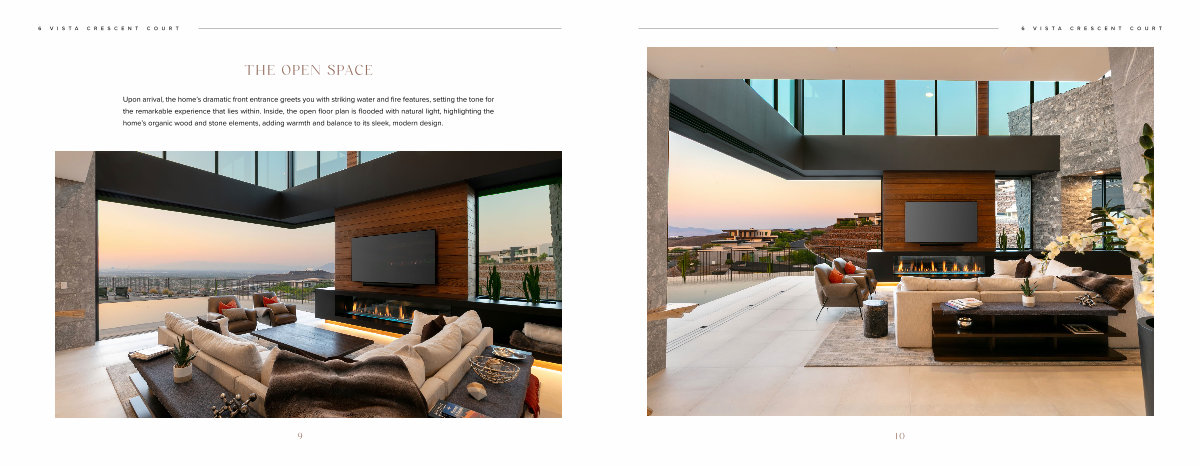 Upon arrival, the home’ s dramatic front entrance greets you with striking water and fire features, setting the tone for the remarkable experience that lies within. Inside, the open floor plan is flooded with natural light, highlighting the home’ s organic wood and stone elements, adding warmth and balance to its sleek, modern design.
