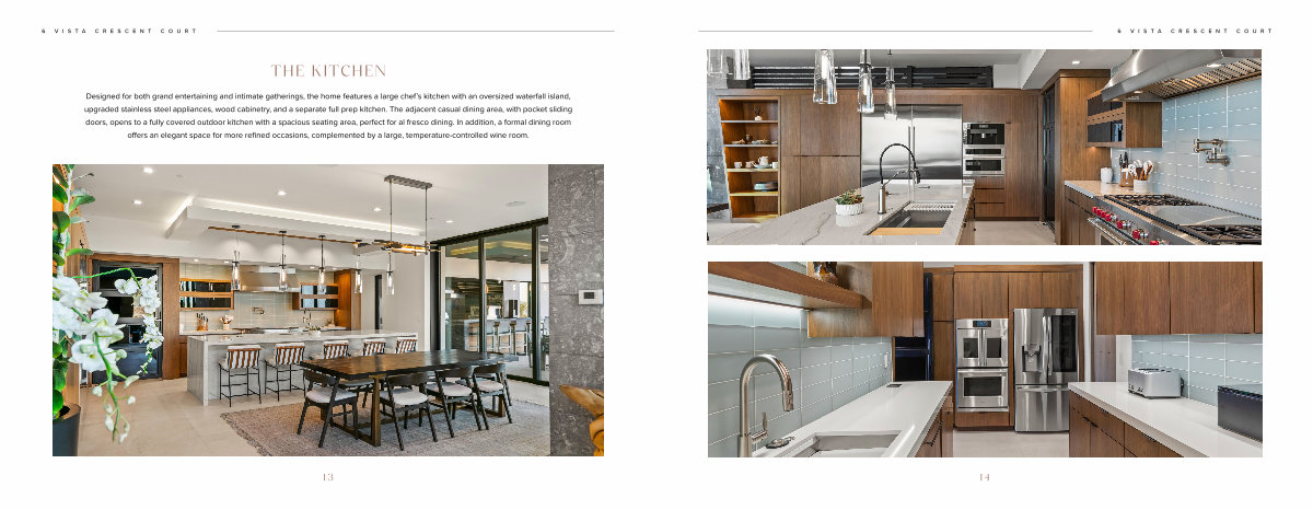 Designed for both grand entertaining and intimate gatherings, the home features a large chef’ s kitchen with an oversized waterfall island, upgraded stainless steel appliances, wood cabinetry, and a separate full prep kitchen. The adjacent casual dining area, with pocket sliding doors, opens to a fully covered outdoor kitchen with a spacious seating area, perfect for al fresco dining. In addition, a formal dining room offers an elegant space for more refined occasions, complemented by a large, temperature-controlled wine room.