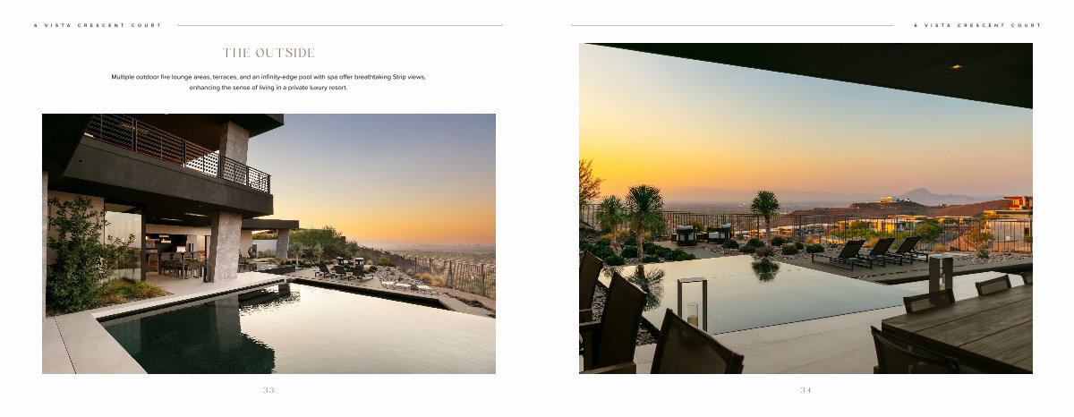 Multiple outdoor fire lounge areas, terraces, and an infinity-edge pool with spa offer breathtaking Strip views, enhancing the sense of living in a private luxury resort.