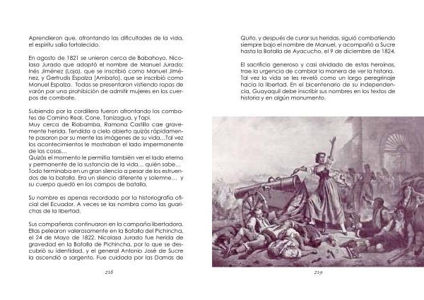 En agosto de 1821 se unieron cerca de Babahoyo , Nicolasa Jurado que adoptó el nombre de Manuel Jurado ; Inés Jiménez ( Loja ), que se inscribió como Manuel Jiménez , y Gertrudis Espalza ( Ambato ), que se inscribió como Manuel Espalza . Todas se presentaron vistiendo ropas de varón por una prohibición de admitir mujeres en los cuerpos de combate .