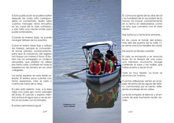 Como el estero tiene flujo y reflujos de mareas , siempre es conveniente remar primero contracorriente , para que el cansancio del regreso nos toque con marea a favor . El botero me ha entregado un chaleco salvavidas , que prefiero no utilizar por tanto calor , confiado en toda la experiencia de remero en los años colegiales .