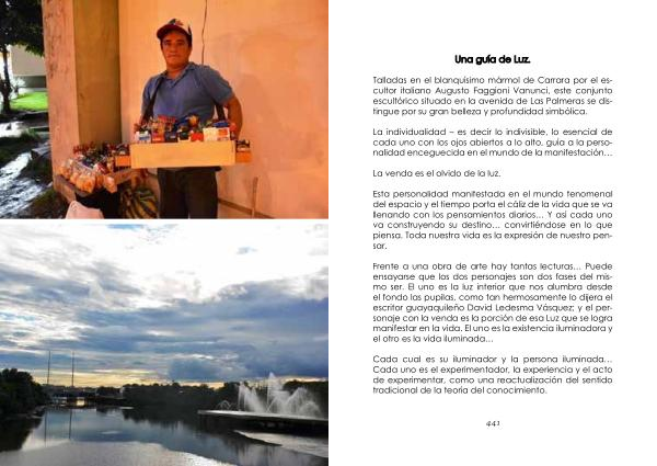 Frente a una obra de arte hay tantas lecturas … Puede ensayarse que los dos personajes son dos fases del mismo ser . El uno es la luz interior que nos alumbra desde el fondo las pupilas , como tan hermosamente lo dijera el escritor guayaquileño David Ledesma Vásquez ; y el personaje con la venda es la porción de esa Luz que se logra manifestar en la vida . El uno es la existencia iluminadora y el otro es la vida iluminada …