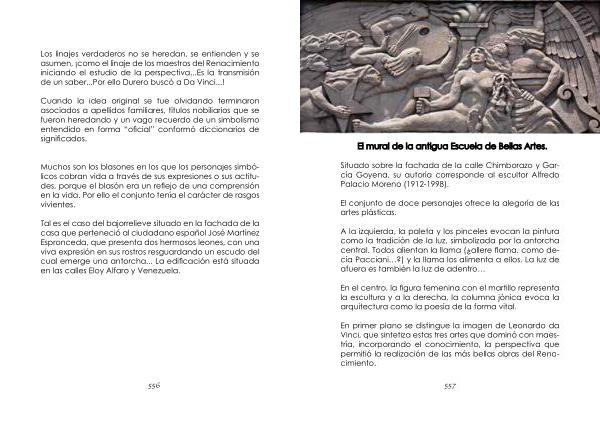 Tal es el caso del bajorrelieve situado en la fachada de la casa que perteneció al ciudadano español José Martínez Espronceda , que presenta dos hermosos leones , con una viva expresión en sus rostros resguardando un escudo del cual emerge una antorcha ... La edificación está situada en las calles Eloy Alfaro y Venezuela .