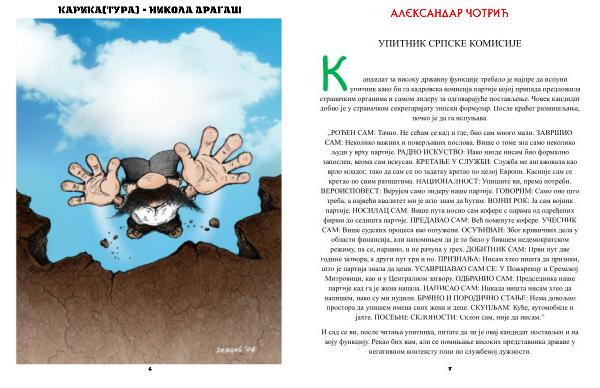 „ РОЂЕН САМ : Тачно . Не сећам се кад и где , био сам много мали . ЗАВРШИО САМ : Неколико важних и поверљивих послова . Више о томе зна само неколико људи у врху партије . РАДНО ИСКУСТВО : Иако нигде нисам био формално запослен , веома сам искусан . КРЕТАЊЕ У СЛУЖБИ : Служба ме ангажовала као врло младог , тако да сам се по задатку кретао по целој Европи . Касније сам се кретао по свим ратиштима . НАЦИОНАЛНОСТ : Упишите ви , према потреби . ВЕРОИСПОВЕСТ : Верујем само лидеру наше партије . ГОВОРИМ : Само оно што треба , а највећи квалитет ми је што знам да ћутим . ВОЈНИ РОК : Ја сам војник партије . НОСИЛАЦ САМ : Више пута носио сам кофере с парама од одређених фирми до седишта партије . ПРЕДАВАО САМ : Већ поменуте кофере . УЧЕСНИК САМ : Више судских процеса као оптужени . ОСУЂИВАН : Због кривичних дела у области финансија , али напомињем да је то било у бившем недемократском режиму , па се , наравно , и не рачуна у грех . ДОБИТНИК САМ : Први пут две године затвора , а други пут три и по . ПРИЗНАЊА : Нисам хтео ништа да признам , што је партија знала да цени . УСАВРШАВАО САМ СЕ : У Пожаревцу и Сремској Митровици , као и у Централном затвору . ОДБРАНИО САМ : Председника наше партије кад га је жена напала . НАПИСАО САМ : Никада ништа нисам хтео да напишем , иако су ми нудили . БРАЧНО И ПОРОДИЧНО СТАЊЕ : Нема довољно простора да упишем имена свих жена и деце . СКУПЉАМ : Куће , аутомобиле и јахте . ПОСЕБНЕ СКЛОНОСТИ : Склон сам , није да нисам .”
