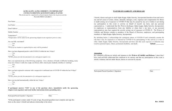 ALPHA KAPPA ALPHA SORORITY , INCORPORATED ® COVID-19 SCREENING QUESTIONNAIRE & WAIVER This form must be completed by all participants before the in-person activity . PLEASE PRINT LEGIBLY .