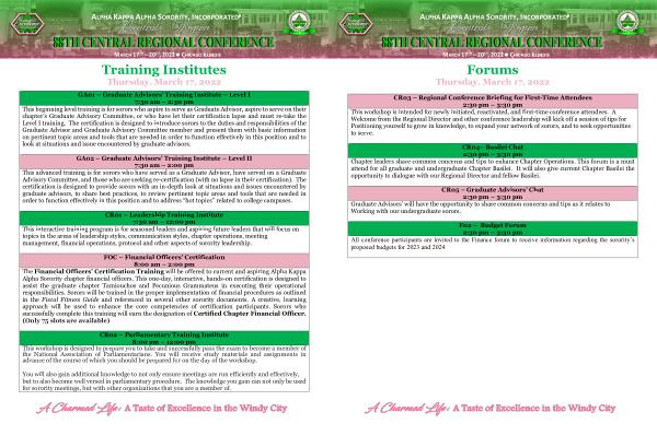 7:30 am – 12:00 pm This interactive training program is for seasoned leaders and aspiring future leaders that will focus on topics in the areas of leadership styles , communication styles , chapter operations , meeting management , financial operations , protocol and other aspects of sorority leadership .