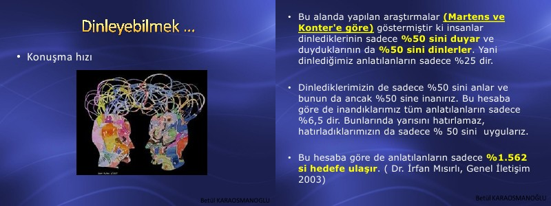 • Bu alanda yapılan araştırmalar( Martens ve Konter ' e göre) göstermiştir ki insanlar dinlediklerinin sadece % 50 sini duyar ve duyduklarının da % 50 sini dinlerler. Yani dinlediğimiz anlatılanların sadece % 25 dir.