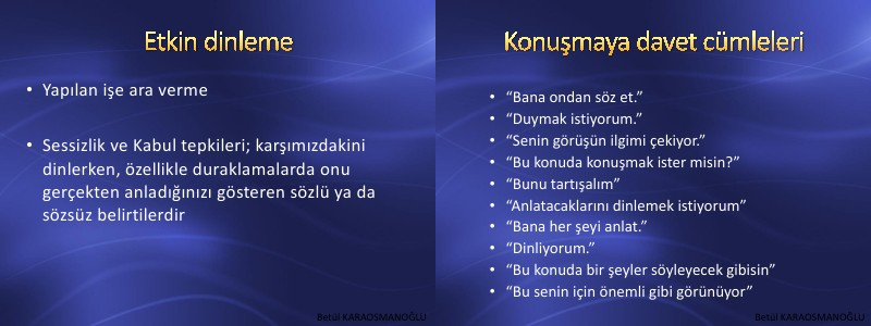• Sessizlik ve Kabul tepkileri; karşımızdakini dinlerken, özellikle duraklamalarda onu gerçekten anladığınızı gösteren sözlü ya da sözsüz belirtilerdir
