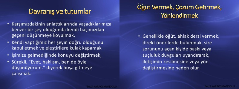 • Genellikle öğüt, ahlak dersi vermek, direkt önerilerde bulunmak, size sorununu açan kişide baskı veya suçluluk duyguları uyandırarak, iletişimin kesilmesine veya yön değiştirmesine neden olur.