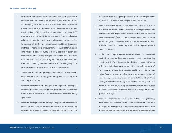 1 . Do medical staff or other clinical leaders – particularly those with responsibilities for making recommendations / decisions related to privileging ( which may include specialty chiefs , department chairs , medical / dental / behavioral health / pharmacy directors , chief medical officers , credentials committee members , MEC members , and governing board members ) receive education related to regulatory and accreditation requirements related to privileging ? Do they get education related to contemporary methods of meeting those requirements ? The Center for Medicare and Medicaid Services ( CMS ) has very specific requirements related to criteria-based privileging that medical staff and other clinical leaders need to know . They also need to know the various methods of meeting those requirements if they are going to be able to address any deficiencies in their current system .