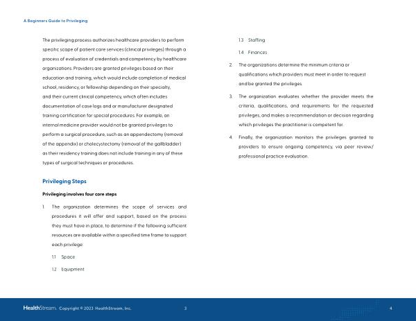 The privileging process authorizes healthcare providers to perform specific scope of patient care services ( clinical privileges ) through a process of evaluation of credentials and competency by healthcare organizations . Providers are granted privileges based on their education and training , which would include completion of medical school , residency , or fellowship depending on their specialty , and their current clinical competency , which often includes documentation of case logs and or manufacturer designated training certification for special procedures . For example , an internal medicine provider would not be granted privileges to perform a surgical procedure , such as an appendectomy ( removal of the appendix ) or cholecystectomy ( removal of the gallbladder ) as their residency training does not include training in any of these types of surgical techniques or procedures .