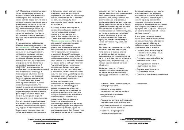 А потому, прежде чем отправить какое либо сообщение, особенно частного характера, следует подумать о том, надо ли это делать. Как говорил Мюллер из“ Семнадцати мгновений весны”:“ Верить никому нельзя …” Особенно это касается скоропалительных знакомств с анонимными адресатами в киберпространстве. Ведь никто не даст гарантий того, что“ очаровательная блондинка с шикарной фигурой”, желающая познакомиться с“ честным, добрым, отзывчивым парнем” и трубящая об этом на весь мир, таковой и является на самом деле. И не будет ли потом“ мучительно больно” за излишне откровенную беседу, когда вдруг выяснится, что это толстый дядька с неизвестно какими наклонностями или, что еще хуже, ушлый журналист, готовящий“ горячий” репортаж в одну из“ сомнительных” газетенок.…