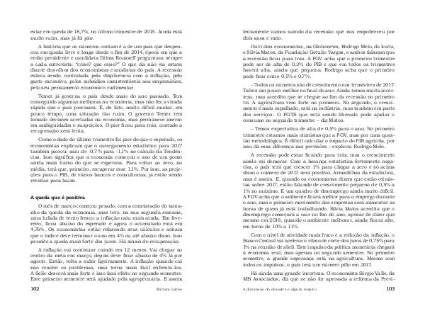A história que os números contam é a de um país que despencou em queda livre e longa desde o fim de 2014, época em que a então presidente e candidata Dilma Rousseff perguntava sempre a cada entrevista:“ crise? que crise?” O que ela não via estava diante dos olhos dos economistas e analis tas do país. A recessão estava sendo contrata da pela displicência com a inflação, pelo gasto excessivo, pelos subsídios insustentáveis aos empresários, pelo seu pensamento econômico rudimentar.