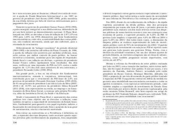 Em grande parte, a boa ou má situação dos fundamentos macroeconômicos, somada à conjuntura internacional, terá contribuído para que o crescimento do PIB fosse de 2,4 % nos governos do presidente Fernando Henrique Cardoso( 1995-2001), de 4 % nos governos do presidente Luiz Inácio Lula da Silva( 2003- 2010) e de-0,75 % nos governos da presidente Dilma Rousseff( 2011-2016), com repercussões na renda, no emprego e no financiamento do Bem-Estar Social, a começar pela própria Previdência, além da Assistência Social, da Saúde e da Educação.
