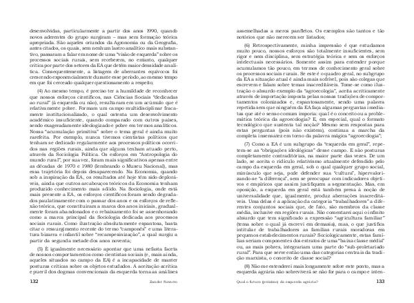 desenvolvidas, particularmente a partir dos anos 1990, quando novos aderentes do grupo surgiram – mas sem formação teórica apropriada. São aqueles oriundos da Agronomia ou da Geografia, antes citados, os quais, sem nenhum lastro analítico mais substantivo, passaram a falar em nome de uma“ visão de esquerda” sobre os processos sociais rurais, sem receberem, no entanto, qualquer crítica por parte dos setores da EA que detêm maior densidade analítica. Consequentemente, a listagem de aberrantes equívocos foi crescendo exponencialmente durante esse período, ao mesmo tempo em que foi cerceado qualquer questionamento a respeito;