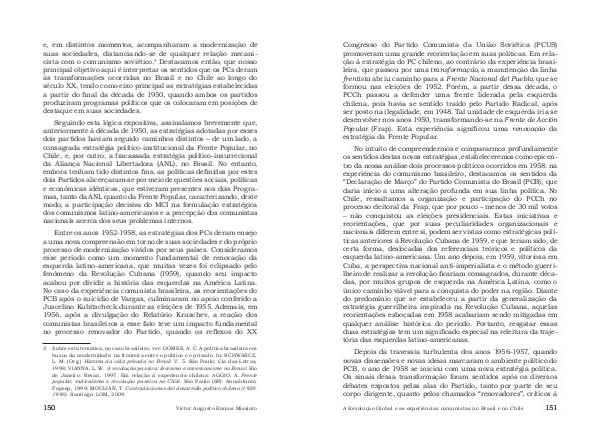 No intuito de compreendermos e compararmos profundamente os sentidos destas novas estratégias, estabeleceremos como epicentro da nossa análise dois processos políticos ocorridos em 1958: na experiência do comunismo brasileiro, destacamos os sentidos da“ Declaração de Março” do Partido Comunista do Brasil( PCB), que daria início a uma alteração profunda em sua linha política. No Chile, ressaltamos a organização e participação do PCCh no processo eleitoral da Frap, que por pouco – menos de 30 mil votos – não conquistou as eleições presidenciais. Estas iniciativas e reorientações, que por suas peculiaridades organizacionais e nacionais diferem entre si, podem ser vistas como estratégicas políticas anteriores à Revolução Cubana de 1959, e que teriam sido, de certa forma, deslocadas dos referenciais teóricos e políticos da esquerda latino-americana. Um ano depois, em 1959, vitoriosa em Cuba, a perspectiva nacional anti-imperialista e o método guerrilheiro de realizar a revolução ficariam consagrados, durante décadas, por muitos grupos de esquerda na América Latina, como o único caminho viável para a conquista do poder na região. Diante do predomínio que se estabeleceu a partir da generalização da estratégia guerrilheira inspirada na Revolução Cubana, aquelas reorientações esboçadas em 1958 acabariam sendo mitigadas em qualquer análise histórica do período. Portanto, resgatar essas duas estratégias tem um significado especial na releitura da trajetória das esquerdas latino-americanas.