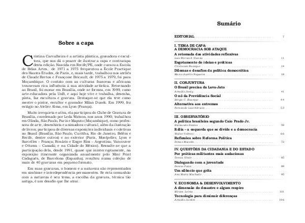 Cristina Carvalheira é a artista plástica, gravadora e escultora, que nos dá o prazer de ilustrar a capa e contracapa desta edição. Nascida em Recife / PE, onde cursou a Escola de Belas Artes, de 1971 a 1975 frequentou a École Practique des Hautes Études, de Paris, e, mais tarde, trabalhou nos ateliês de Claude Breton e Françoise Bricault; de 1975 a 1979, foi para Moçambique. O contato com as culturas francesa e africana trouxeram rica influência à sua atividade artística. Retornando ao Brasil, foi morar em Brasília, onde se formou, em 1989, como arte-educadora pela UnB, e aqui hoje vive e trabalha, desenha, pinta, faz escultura e gravura. Destaque-se que ela teve como mestre o pintor, escultor e gravador Milan Dusek. Em 1999, fez estágio no Atelier Alma, em Lyon( França).